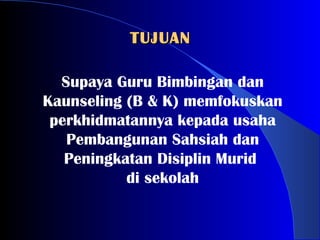 Antara matlamat bagi kaunseling dan Bimbingan ialah-. Berdasarkan kepada buku panduan perlaksanaan perkhidmatan bimbingan dan kaunseling tahun 2009 ada menyatakan kaunselor menjadi AJK dalam Majlis Perancang Sekolah pada ms 20 no 20 bg gbk sek rendah dan pd ms 21 no 20 pada gbk sek men. Supaya Guru Bimbingan dan Kaunseling B K memfokuskan perkhidmatannya kepada usaha Pembangunan Sahsiah dan Peningkatan Disiplin Murid di sekolah.